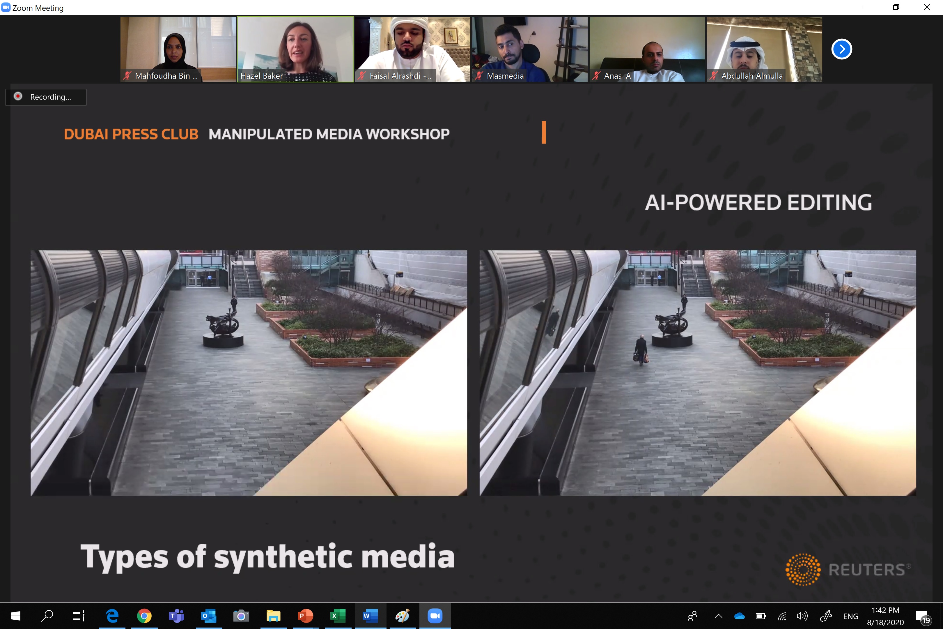 وتابعت هيزل، ويسعدنا أن نتعاون مع نادي دبي للصحافة لنضع خبرتنا في مكافحة الأخبار والمواد المزيفة بين إيدي المشاركين في ورشة العمل للاطلاع على أمثلة حقيقية وحالات افتراضية تعاملت معها رويترز في هذا الجانب، كما وفرنا للمشاركين فرصة للاطلاع على التكنولوجيا المتطورة المستخدمة في إنشاء واكتشاف التلاعب الإعلامي، بما في ذلك التهديد الجديد الذي يسمى بـ "التزييف العميق".