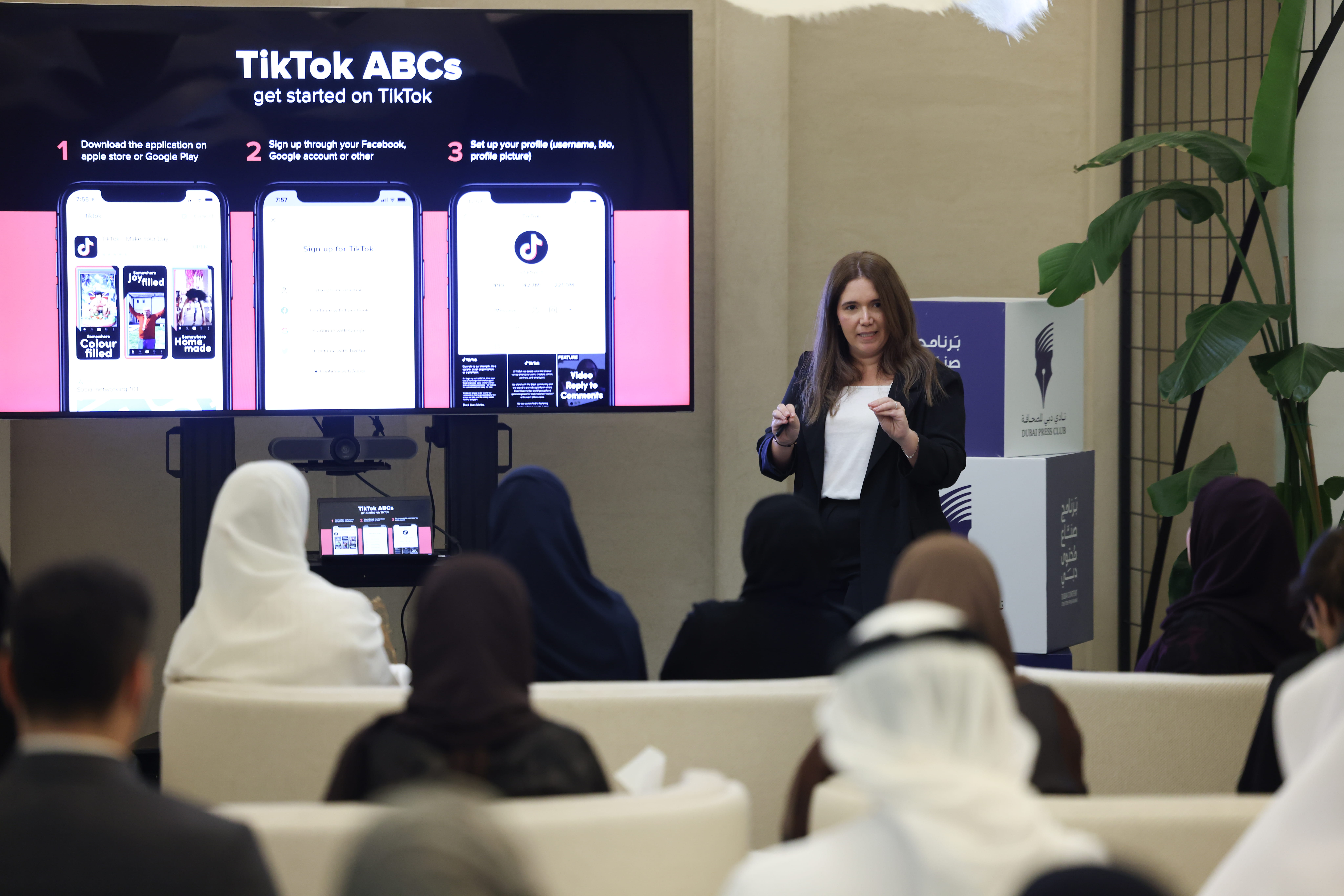 إلى ذلك استعرضت سارة المعاز أساسيات تتعلق بمنصة "تيك توك" بما في ذلك كيفية الاستفادة من الإمكانات التي تتيحها المنصة، واستراتيجيات صناعة المحتوى الناجح القادر على التأثير ومن ثم استقطاب انتباه واهتمام جمهور المتلقين، كذلك استعرضت الأدوات والخصائص التي تضمَّنت سبل تحسين الاستخدام والمزايا الجديدة للمنصة، فيما تناولت الجلسة أيضاً سبل التعمّق في المحتوى من خلال الاهتمام بالفكرة والتفكير في كيفية جعلها مصدر إلهام.