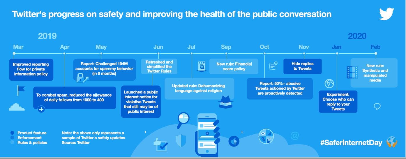 Over the past 12 months, Twitter has taken many steps to build a healthier platform. Rules were updated to make them easier to understand, and a new function that enables people to hide replies to their conversations was introduced. More recently, Twitter shared its new approach to synthetic and manipulated media, which refers to any photo, audio, or video that has been significantly altered or fabricated in a way that intends to mislead people or changes its original meaning.